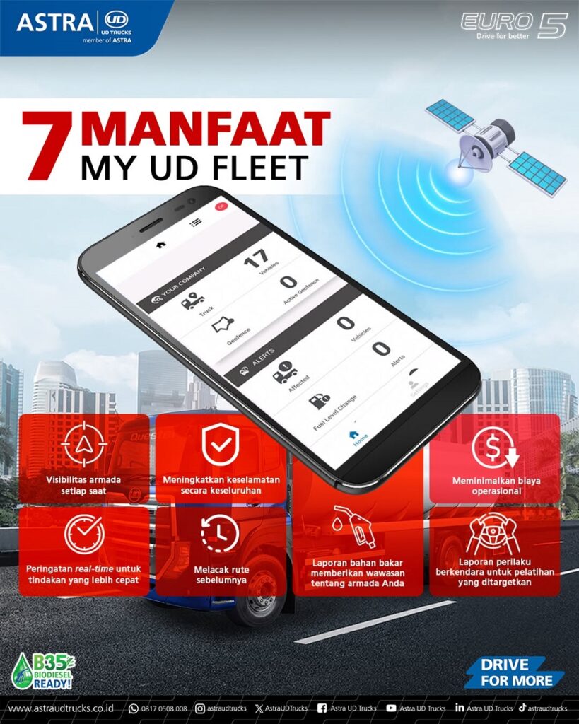 Hadirnya aplikasi My UD Fleet akan membantu memastikan bahwa setiap truk dalam armada Anda bekerja secara optimal. Pemantauan berbasis teknologi memungkinkan manajemen mengurangi downtime kendaraan, mengontrol konsumsi bahan bakar, sekaligus meningkatkan keselamatan pengemudi.