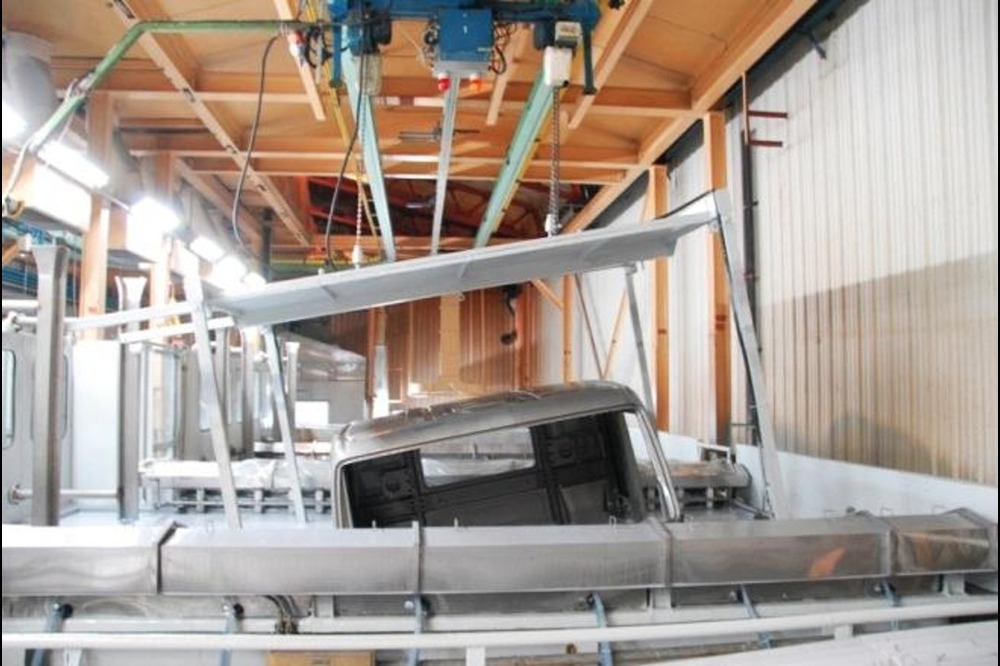 Proses ini melibatkan pencelupan bodi truk yang telah melalui proses pembersihan dari partikel atau kontaminan ke dalam bak berisi larutan cat berbasis air.