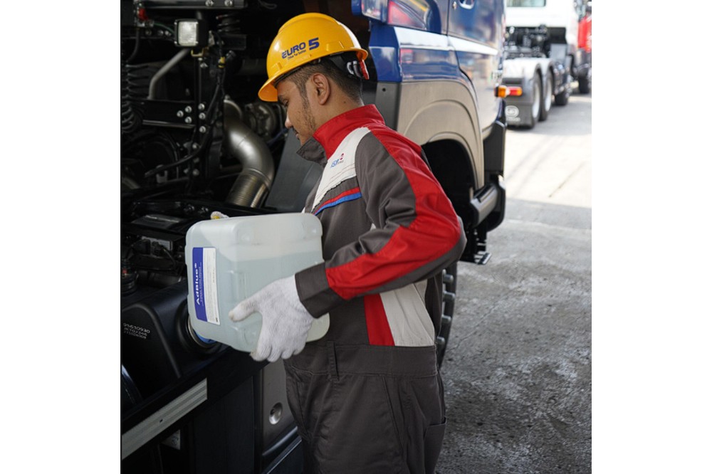 AdBlue adalah cairan berbasis urea dan air demineralisasi yang digunakan untuk mengurangi emisi nitrogen oksida (NOx) dari mesin diesel. Cairan ini tidak dicampurkan langsung ke bahan bakar, tapi disuntikkan ke dalam sistem pembuangan truk, tepatnya melalui teknologi SCR (Selective Catalytic Reduction).